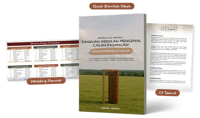 E-book “Bismillah Nikah” akan menemani proses mengenal calon pasangan lewat 8 chapter dengan 50+ pertanyaan untuk bantu kamu berproses dengan adab, menilai dengan tenang, melangkah dengan arah dan bikin kamu lebih yakin dalam menjawab “apakah dia untukku?”